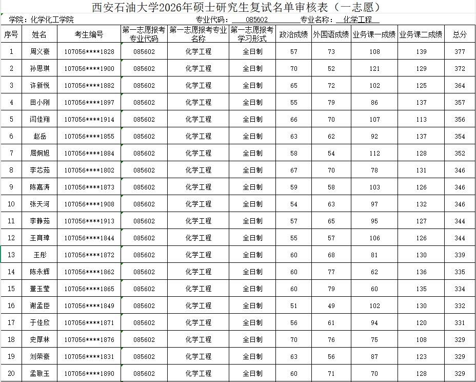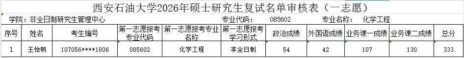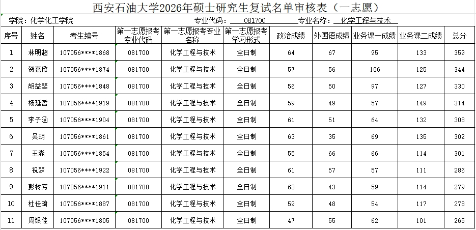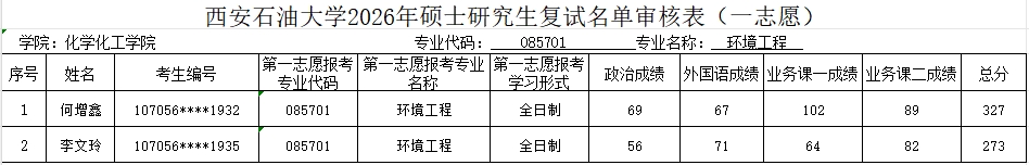 【招生工作】化学化工学院2026年硕士研究生第一志愿复试名单公布