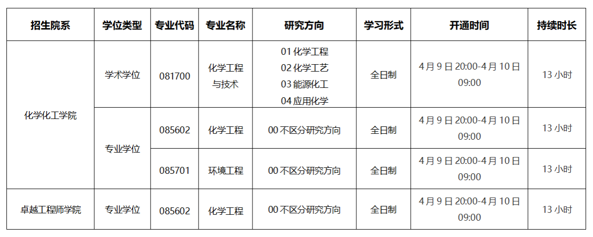 现将化学化工学院2026年硕士研究生调剂系统(调剂第二批)开通时间予以公布,请有意愿调剂至我院相关专业的考生在规定时间内申请。